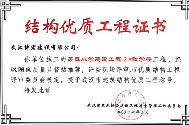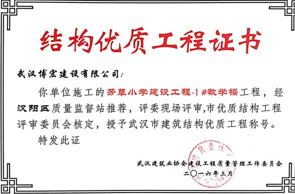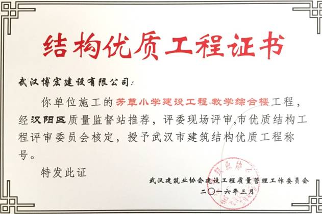 我單位施工的芳草小學建設工程(芳草路與四新北路交匯處西北角)1#教學樓、2#教學樓、教學綜合樓工程,經漢陽區建筑管理站推薦,評委現場評審,武漢建筑業協會建設工程質量管理工作委員會核定,授予武漢市建筑結構優質工程稱號。