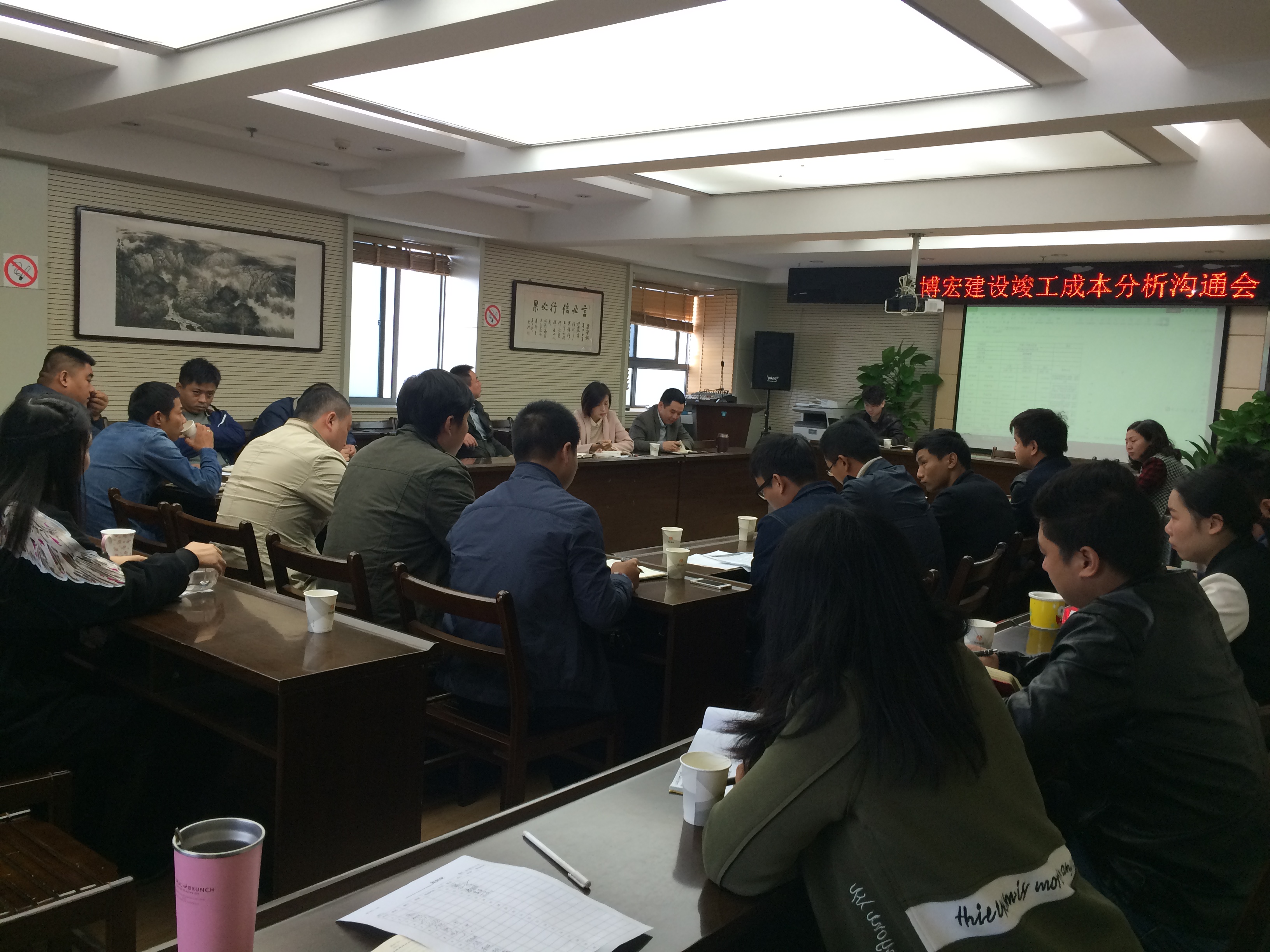 為了進一步促進成本、合同、結算管理工作,博宏公司造價部于20161027日上午9點在公司會議室召開悅城、芳草小學等7個項目的成本分析會,總經理、支部書記、全體項目經理、預算員以及造價部全體人員參加了本次會議。
