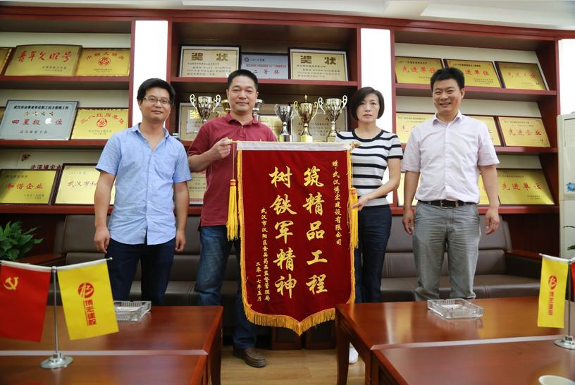 努力成就未來,精品贏得榮譽!614日,因金龍公館4-7樓裝修改造工程建設又快又好,漢陽區食品藥品監督管理局辦公室主任馬濤專程到訪博宏建設,送來錦旗一面表示感謝!