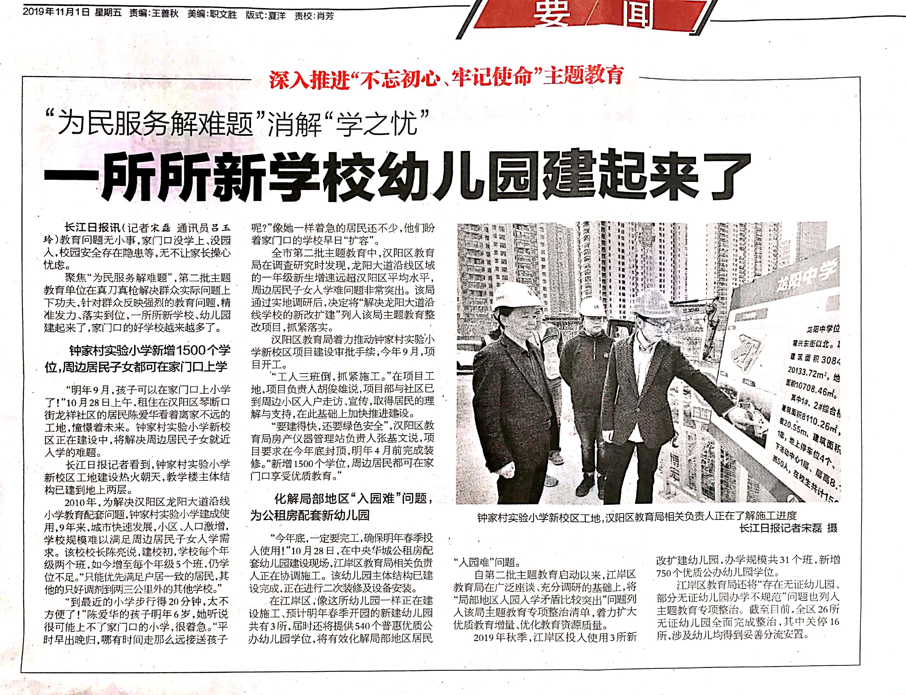 ?????????111日,《長(zhǎng)江日?qǐng)?bào)》以“‘為民服務(wù)解難題’消解‘學(xué)之憂’—一所所新學(xué)校幼兒園建起來了”為題,專題報(bào)道了龍陽中學(xué)項(xiàng)目(該項(xiàng)目建成后35年將作為鐘家村實(shí)驗(yàn)小學(xué)新校區(qū)使用)的在建情況和建設(shè)意義。