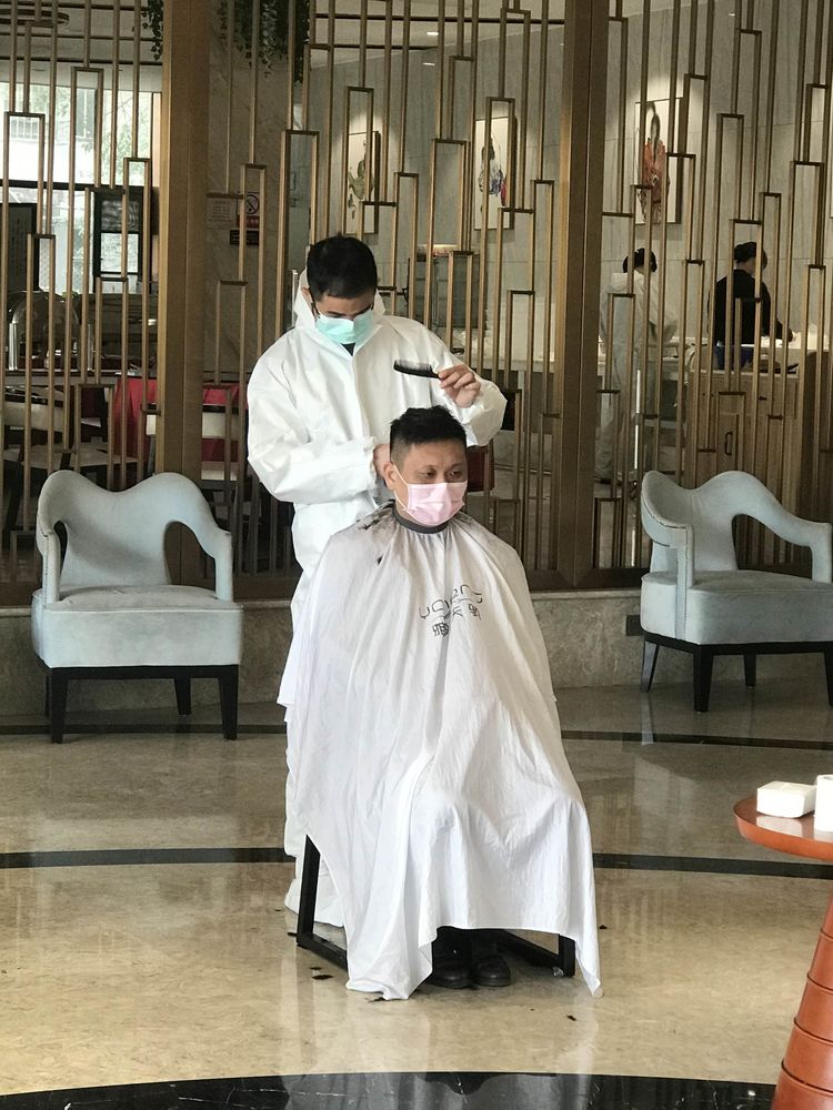 “麻煩幫我剪短點,再剪短點,兩個月沒理過發了,頭發從來沒這么長過!”38日上午10點,搬來幾張椅子、拿上幾把剪發器,“臨時理發店”在紐賓凱酒店大堂正式開業。