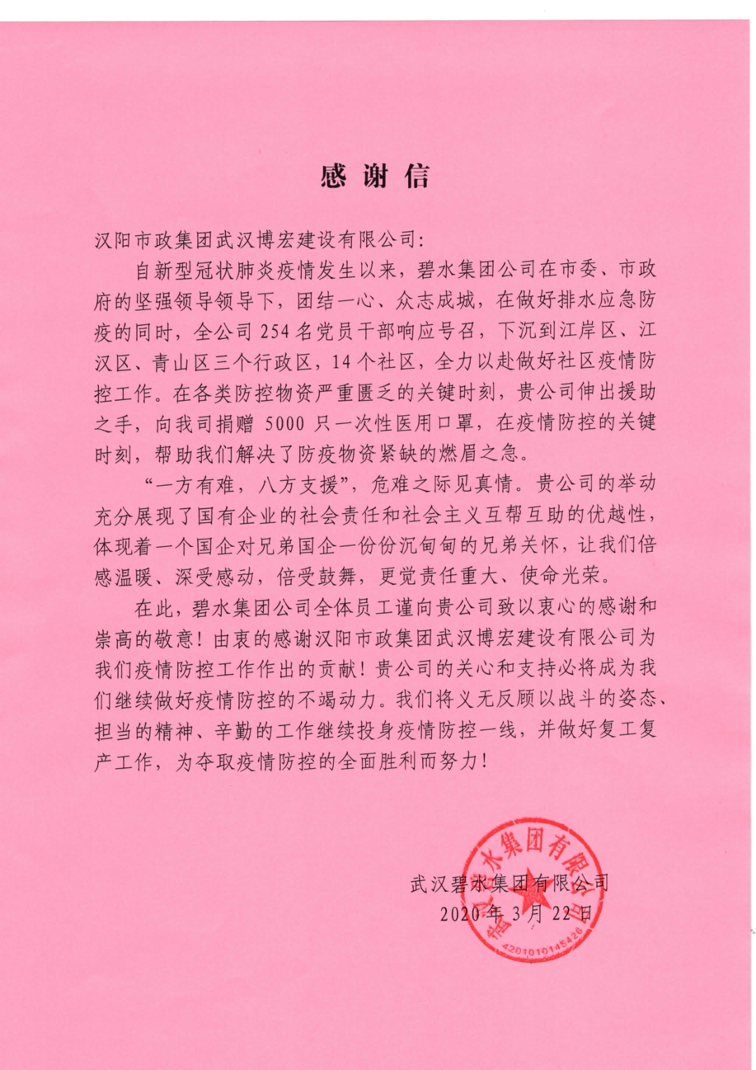 近日,博宏建設收到一封來自武漢碧水集團的一封感謝信。信中表達了對博宏建設在疫情期間解決一線物資燃眉之急所做出的努力。