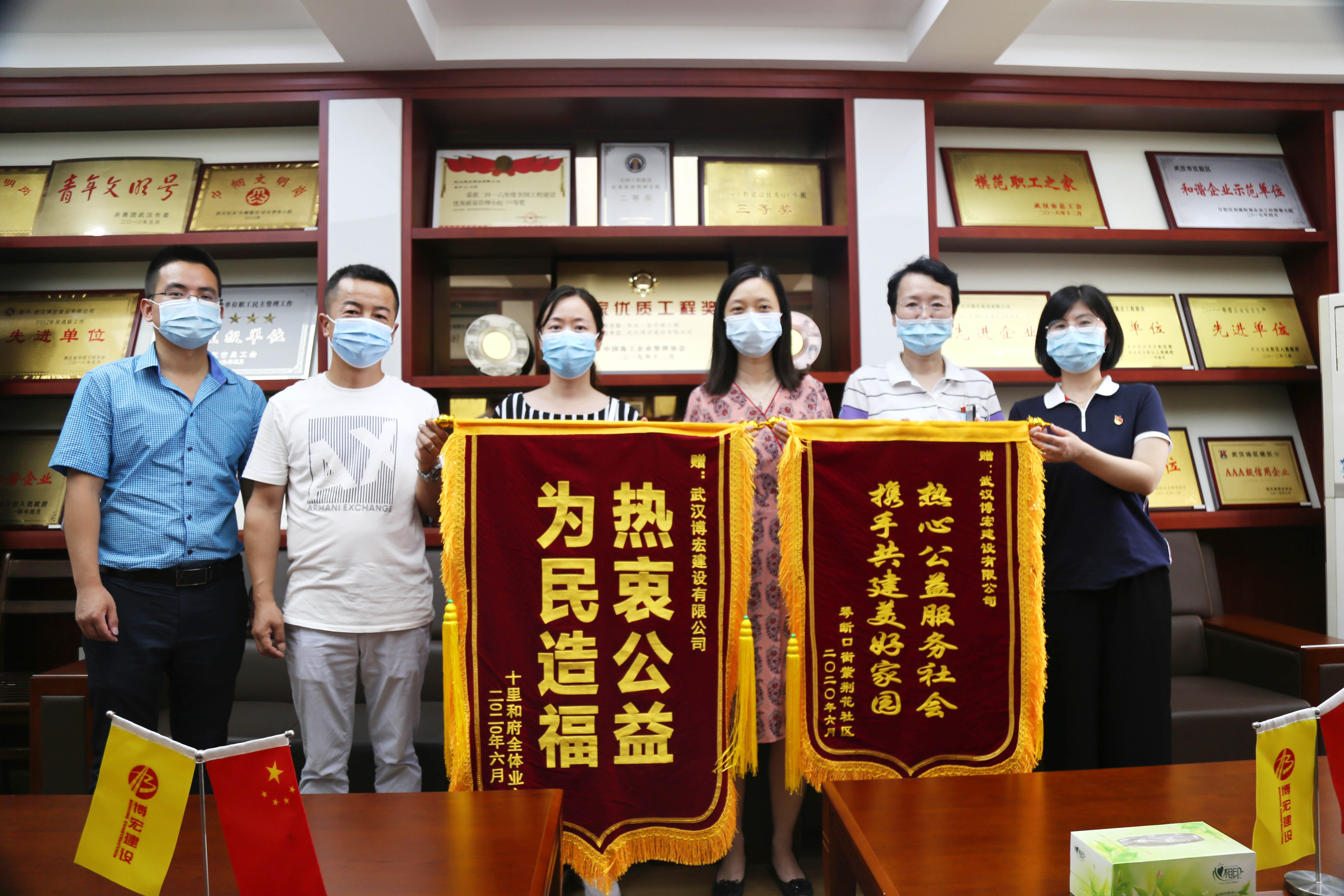 ?? 69日上午,漢陽區委宣傳部代表和漢陽區紫荊花社區、十里和府小區物業代表結伴而來,為博宏建設送來兩面錦旗,感謝博宏建設在改善社區工作環境,服務社區公益事業中做出的努力。據悉,十里和府小區一號樓一樓裝修老舊,地面不平,居民出行不便,博宏建設裝飾裝修項目部在周邊施工時,接到相關指示,先后派出6人歷時6天,一并對該區域近300平米進行了地磚更換,裝修效果得到了居民和社區的高度認可。
