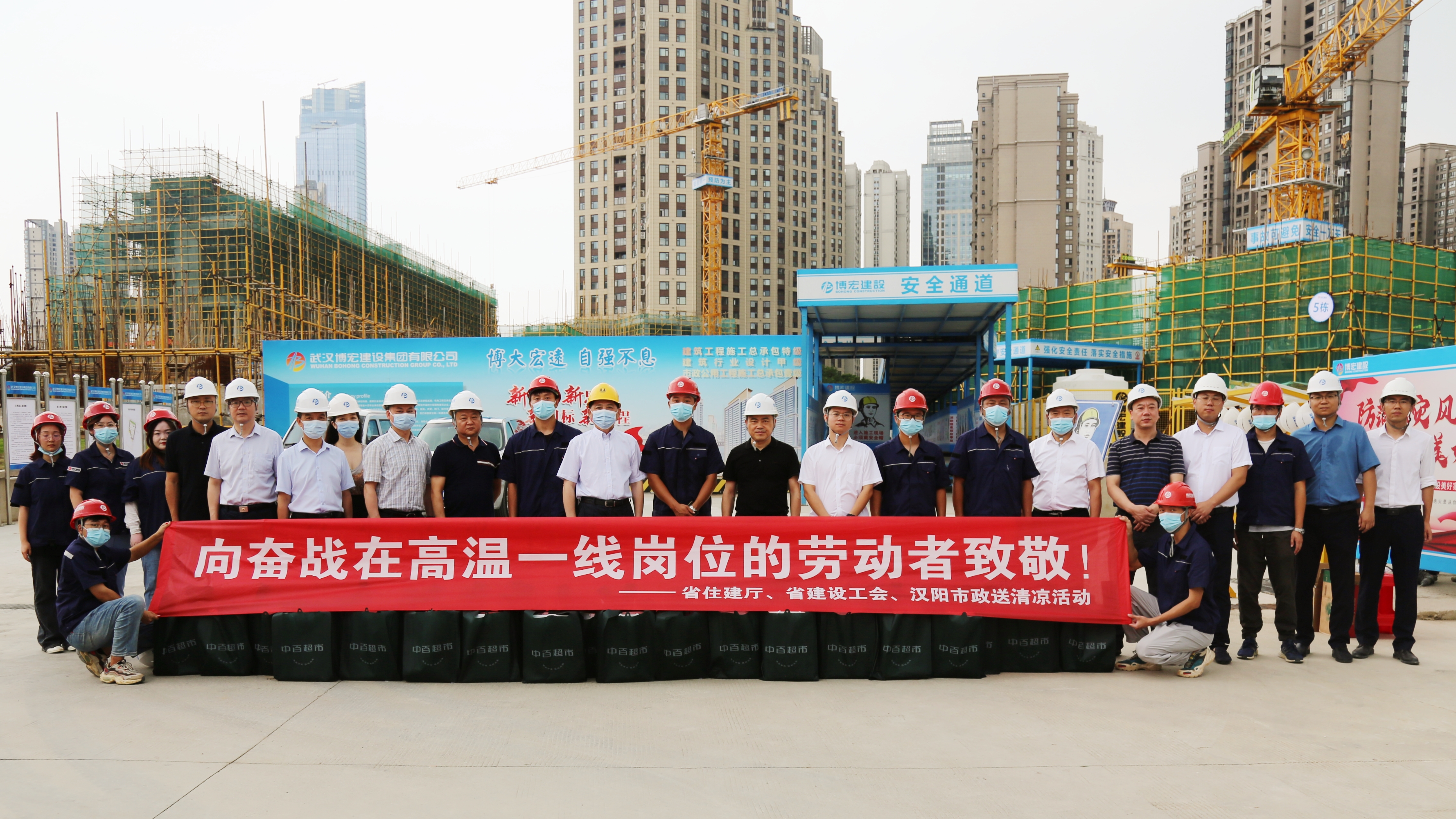 烈日炎炎,酷暑當頭。近日,武漢地區高溫預警不斷拉響。為確保武漢城市建設有序進行,全體博宏人堅守崗位、揮灑汗水、不辭辛勞,奮戰在項目一線。7月28日上午10點整,湖北省住建廳黨組成員、副廳長金濤,住房保障處處長阮斌,房地產市場建管處處長康忠榮,建設工會主任賴濤等領導一行走訪慰問博宏建設集團新建居住、商業項目(月湖船院),漢陽市政黨委書記、董事長嚴悌文,副董事長虞志鵬,武漢城建集團黨委委員、副總經理邢榮斌等陪同調研,共計10余人參加了活動。