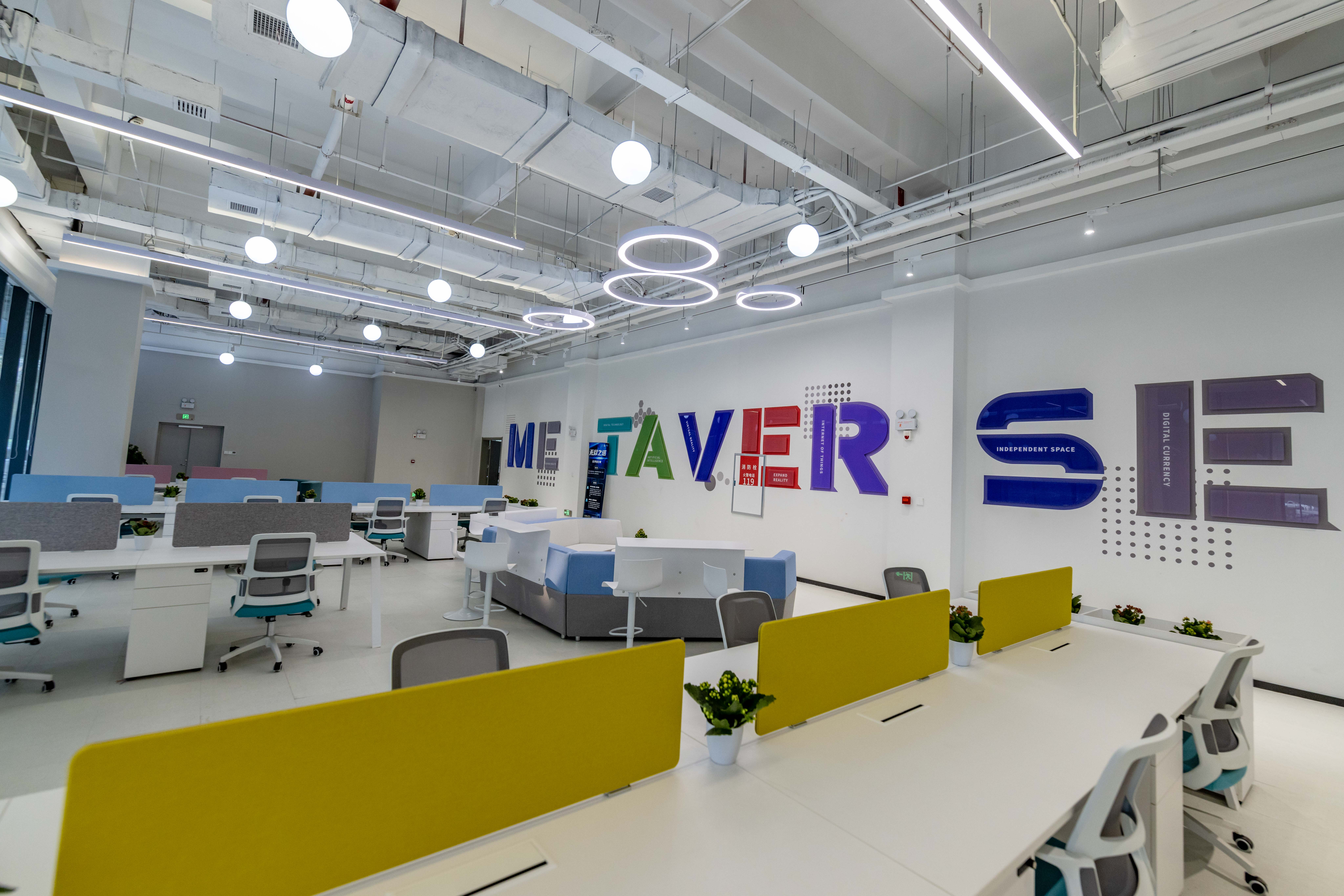 利用不同顏色不同紋理的木紋磚將辦公區(qū)域與休閑區(qū)域進(jìn)行分割。這樣各功能性分區(qū)都有固定的主要功能,也可安置各自的特色家具。整個(gè)空間采用了親和、天然性的裝飾材料,顏色的碰撞、元宇宙元素的融合,創(chuàng)造了具有未來感、幸福感的空間氛圍。