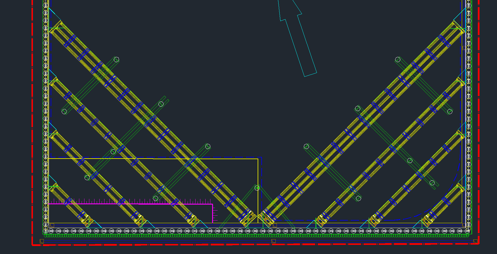 基坑南北兩側采用型鋼角撐,每一側角撐由四道型鋼斜撐組成,與冠梁形成45°角,由內向外有雙拼型鋼和三拼型鋼兩種。型鋼采用HHC400ZC,長度根據標準件長度調整100A~12000A??缍容^大型鋼支撐設型鋼立柱,采用H488型鋼立柱。